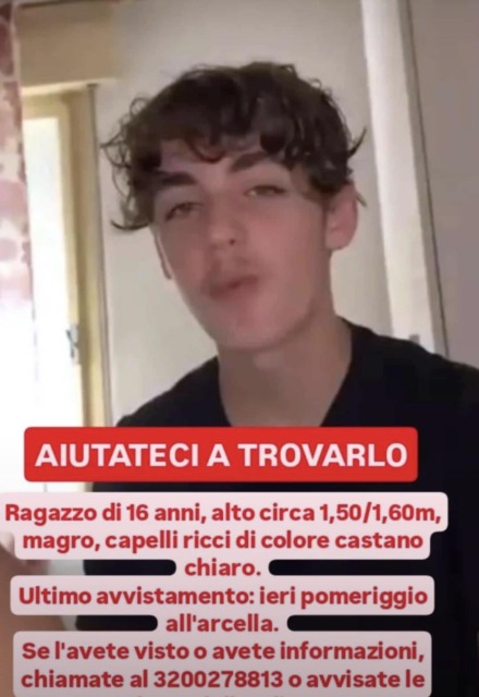 Il ragazzo ha appena compiuto sedici anni ed è alto un metro e sessanta circa, ha i capelli castani un po’ ricci e gli occhi chiari. Secondo il padre non può essere andato tanto lontano poiché senza soldi e documenti, per questo pensa che sia ancora in Città. Inoltre, ipotizza che si possa trovare nei pressi di zona Garibaldi, dove spesso va a mangiare al Kfc.