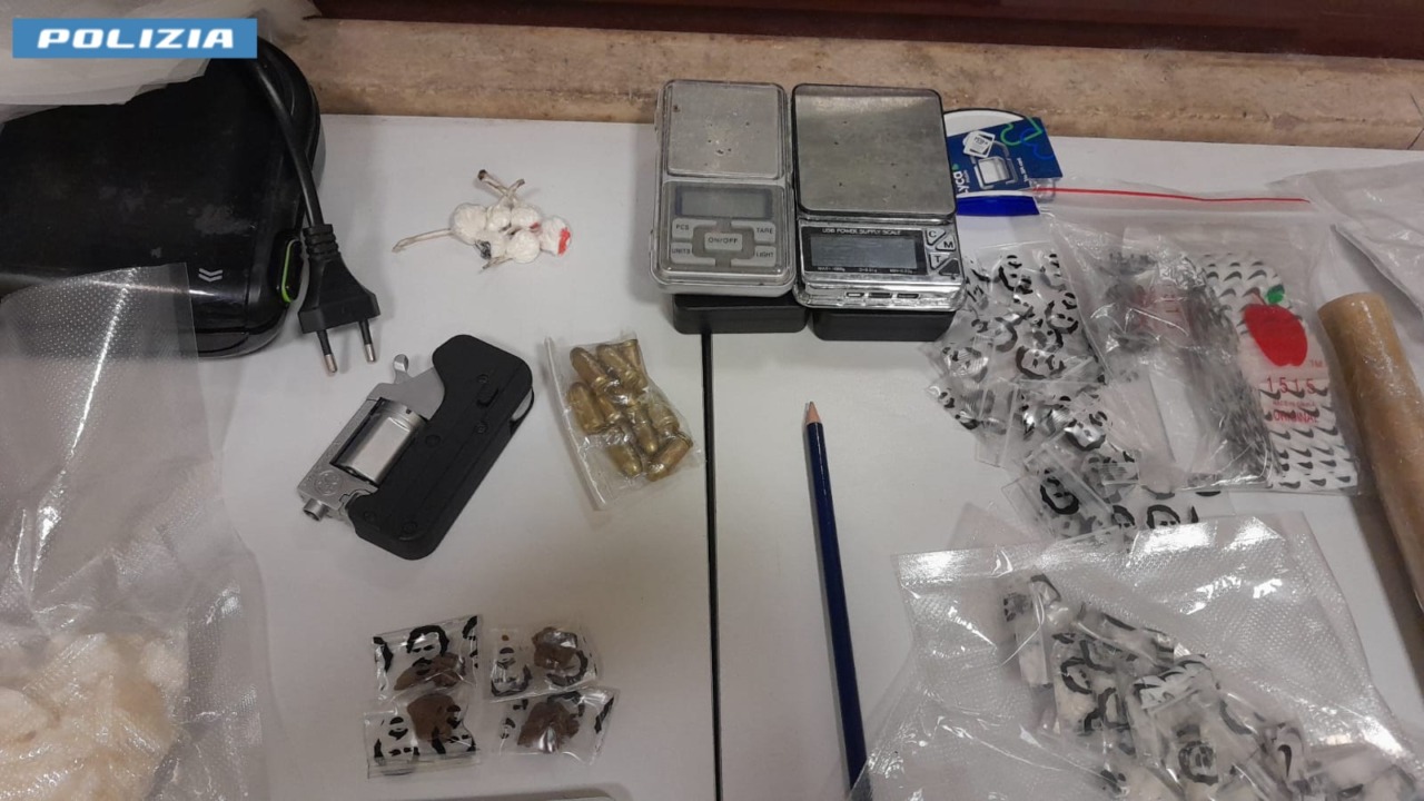 Gli agenti della Squadra Volante del capoluogo hanno fermato un’auto con a bordo uno dei due giovani arrestati che prima ha prima fornito false generalità e poi ha tentato la fuga a piedi. Durante l’inseguimento ha lasciato cadere a terra un oggetto metallico, risultato essere una pistola di tipo revolver, oggetto di furto, con all’interno due proiettili. Bloccato, il giovane aveva anche alcuni involucri di cocaina e 1.200 euro in contanti.
