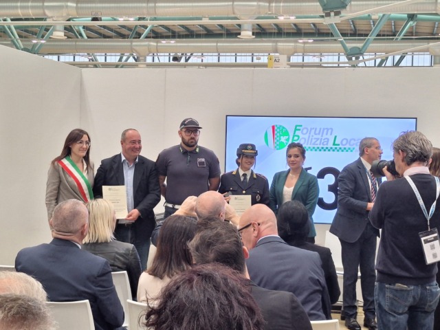 Salvarono un uomo da un’aggressione in strada, la vice commissario della Polizia locale Carolina Vendramini e l’agente Luca Estelli premiati con un encomio solenne al Forum della Polizia locale.