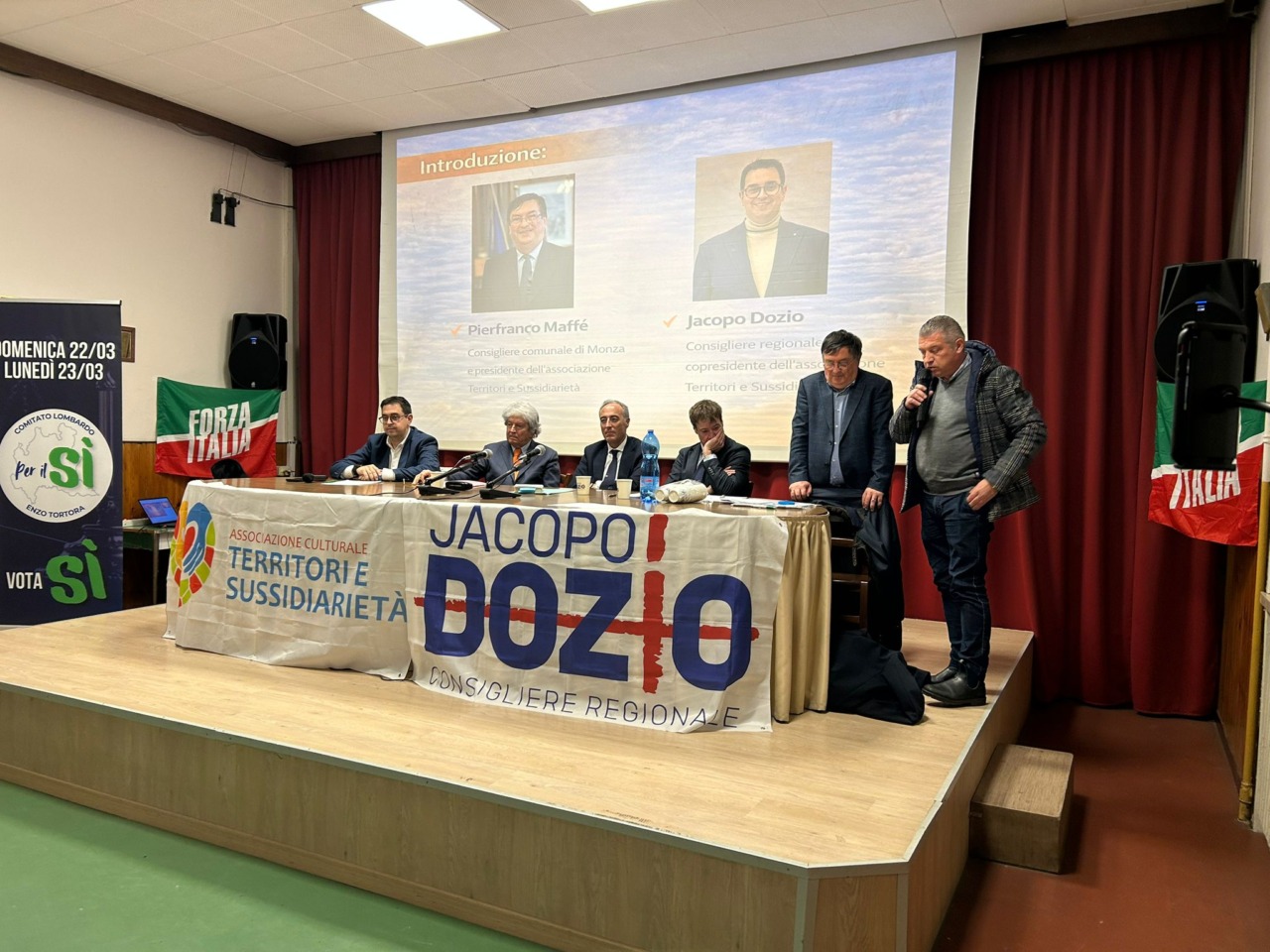 Giovedì all’istituto Leone Dehon di Monza l’associazione Territori e Sussidiarietà guidata dal consigliere comunale di Monza Pierfranco Maffé e dal consigliere regionale di FI Jacopo Dozio ha organizzato un incontro con quattro figure di riferimento per i Comitati del sì come l’avvocato Giulio Gallera, consigliere regionale di Forza Italia e presidente del “Comitato del Sì-Enzo Tortora”, l’avvocato Raffaele Della Valle, difensore di Enzo Tortora ed ex vicepresidente della Camera dei Deputati, l’avvocato Marco Negrini, presidente della Camera Penale di Monza. Nel corso dell’evento è stata trasmessa anche una video-intervista al professore Nicolò Zanon, ex giudice ed ex vicepresidente della Corte Costituzionale, nonché docente costituzionalista dell’Università Statale di Milano e presidente del “Comitato Sì Riforma”.