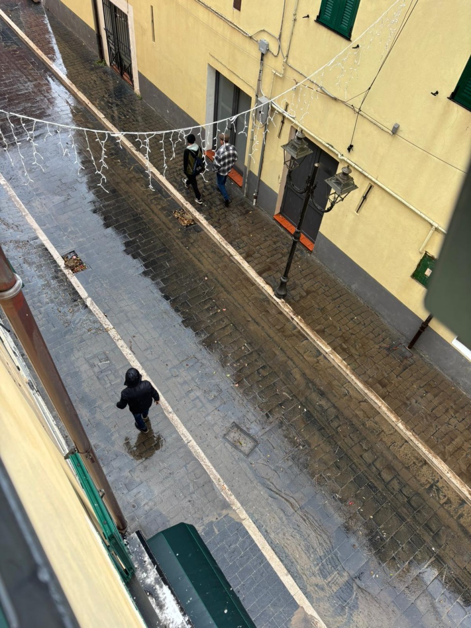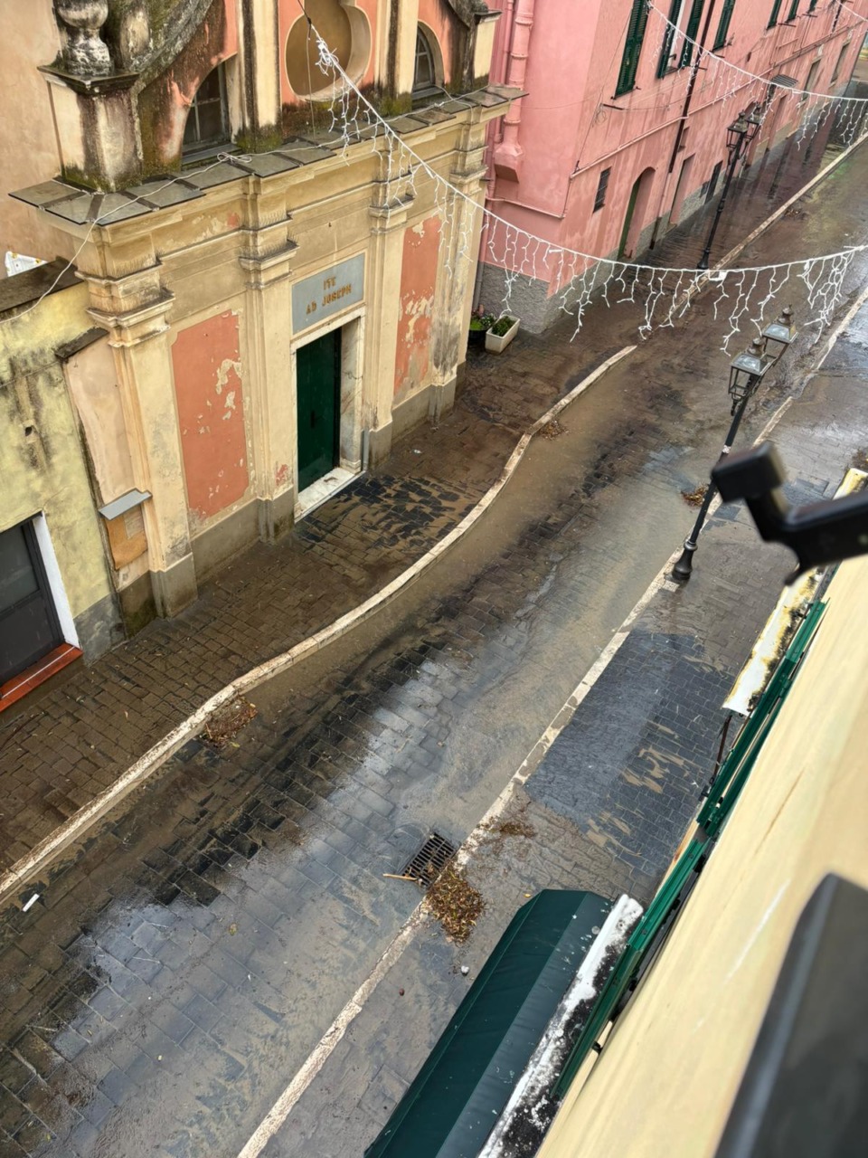 Via San Giuseppe, ad Arma di Taggia, trasformata in un fiume dalla perturbazione che oggi ha attraversato la provincia di Imperia.