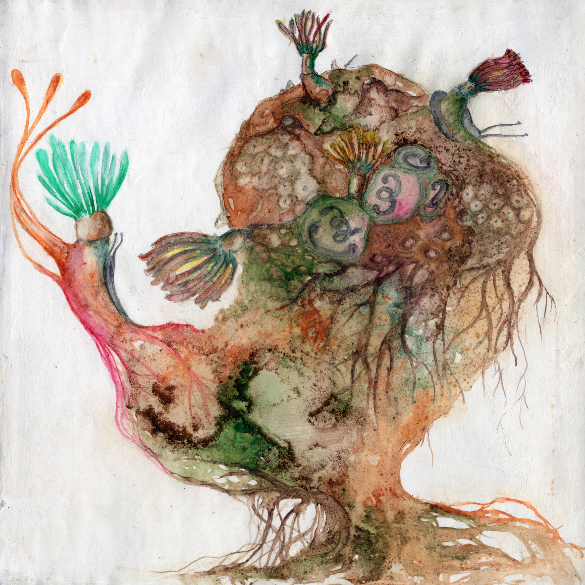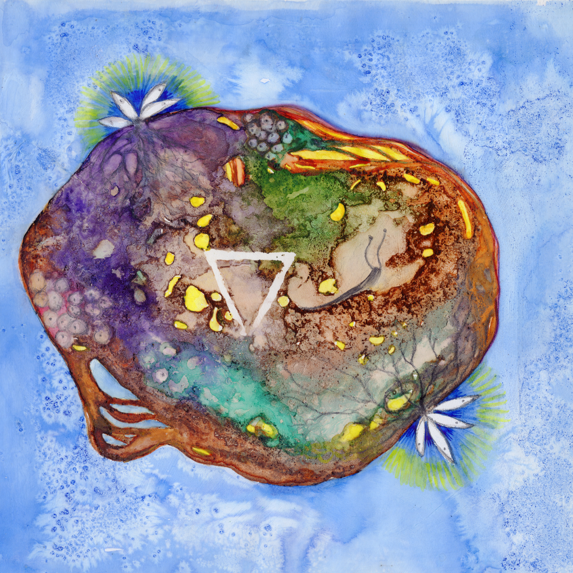 La forza della mostra risiede nella celebrazione della natura come organismo resiliente. Le opere diventano terreni stratificati dove l’energia cellulare si contrae e si espande, dando vita a forme biomorfe che oscillano tra l’astratto e il figurativo. Non è solo pittura, è un’indagine sul rapporto tra i processi atavici e la “Biblioteca Universale” di cui l’uomo è, al contempo, custode e anello evolutivo. In questo ciclo, non esiste un disegno predefinito. Tutto parte dall’incontro primordiale tra acqua e pigmento: è il fluido a trasportare il sentire, a far scorrere il colore finché, solo nel finale, emerge un’immagine riconoscibile. Ciò che rende questo progetto unico è il suo rigoroso processo di genesi. Le opere non nascono nel chiuso di uno studio, ma vengono realizzate esclusivamente in ambiente naturale o nel contatto più intimo con esso. Il processo creativo diventa così un rito che sfida i tempi della produzione contemporanea: ogni lavoro richiede un mese o più di gestazione. Questo tempo dilatato permette all’artista di mutare insieme all’opera: ogni approccio alla tela avviene con una consapevolezza nuova, trasformata dall’esperienza del tempo che passa.
