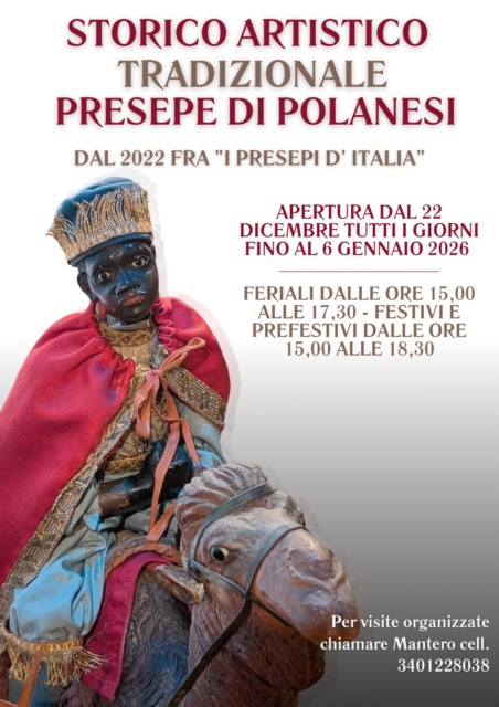 Quest’anno il Presepe di Polanesi si arricchisce di un elemento speciale: nella locandina 2025 compare la foto della statuina restaurata di uno dei Re Magi e del suo cammello, recuperata grazie ai contributi ricevuti dai visitatori durante lo scorso anno. Un gesto di generosità che ha permesso di riportare all’antico splendore una delle figure più iconiche della Natività, simbolo della continuità e dell’amore della comunità per questa tradizione.