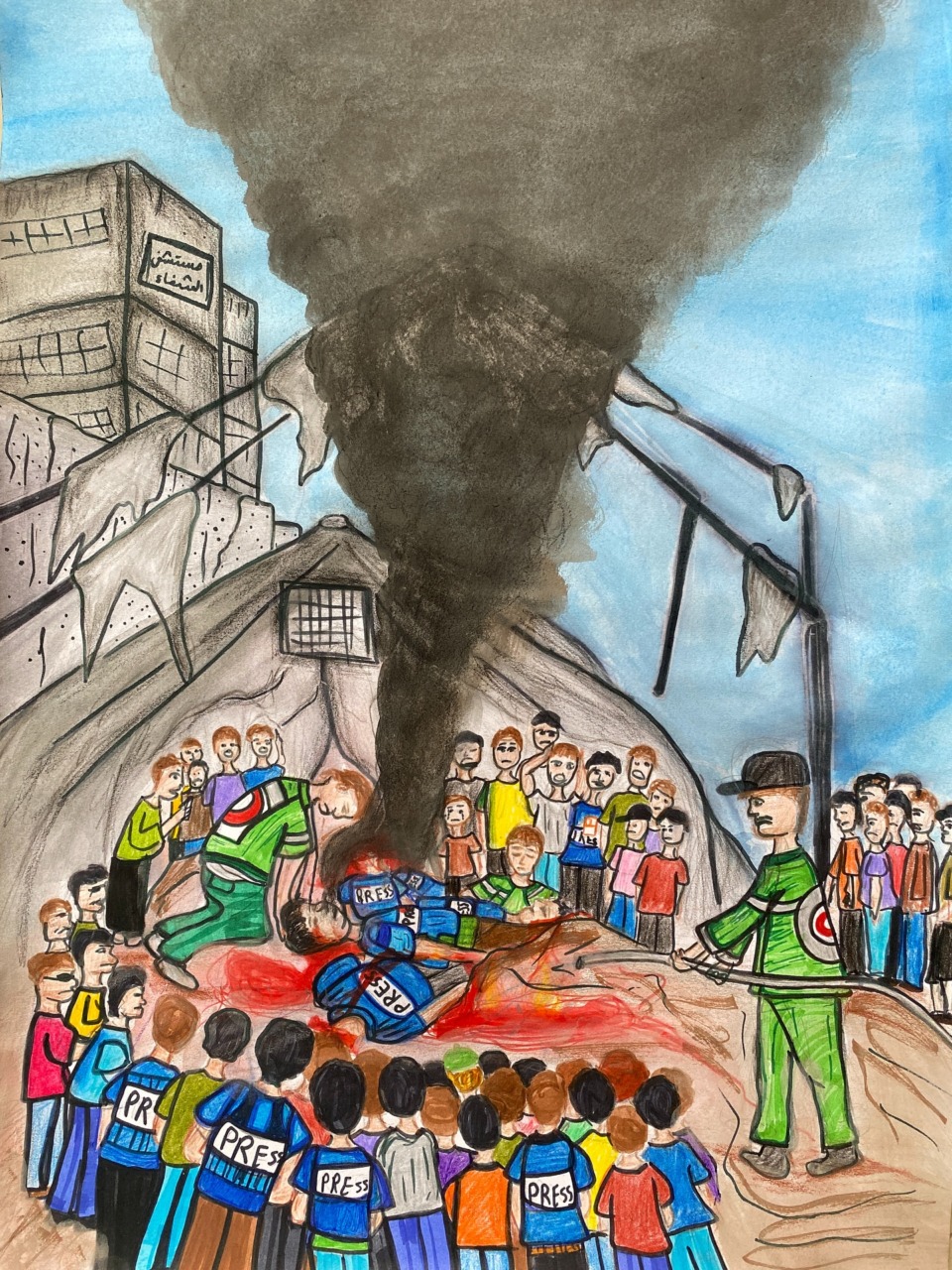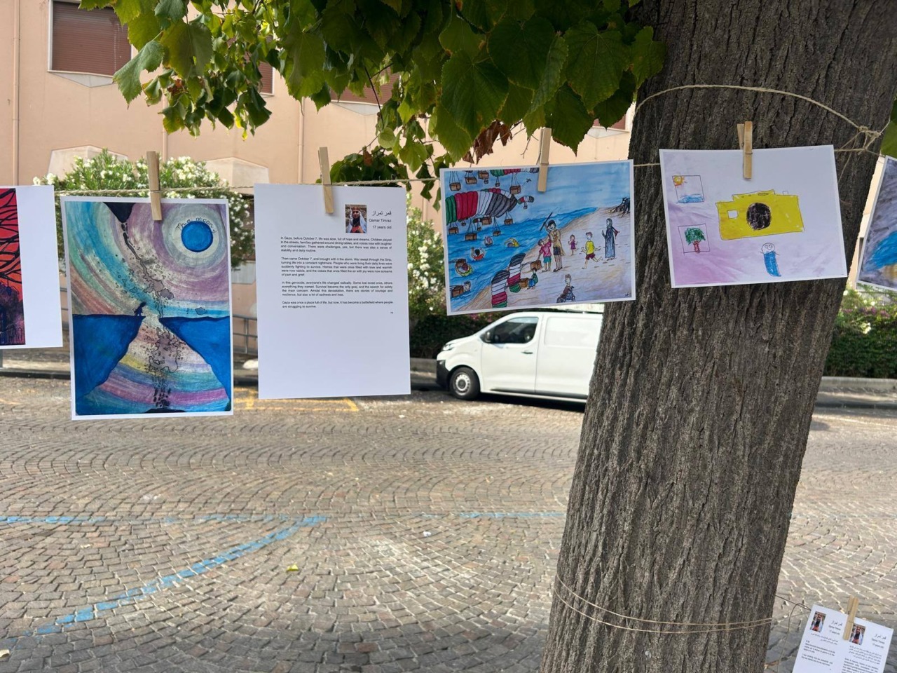 La mostra nasce dall’impegno di Mohamemed Timraz, giovane attivista di Deir al Balah, e di Feile Butler, architetta irlandese, che dalla fine del 2023 hanno dato vita alla cosiddetta “tenda dell’arte”: uno spazio fragile ma fondamentale all’interno delle tendopoli di rifugiati, dove bambine e bambini possono esprimere attraverso il disegno il dolore vissuto, le paure quotidiane, ma anche sogni e speranze. In un contesto segnato da distruzione, fame e lutti, l’arte diventa così uno strumento di resistenza e di sopravvivenza emotiva.