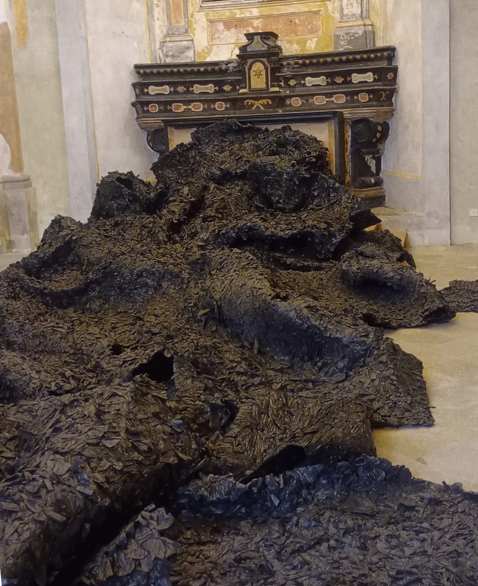 E’ una presenza che “colonizza” la bella chiesa Barocca. Un “tappeto di oscurità” che esattamente come “disturba” l’architettura dell’edificio, dentro di noi deturpa tutto ciò che di buono e di bello l’Umanità sa fare, per tante meraviglie che si realizzano alla fine sembra emergere sempre nella storia. L’ombra è la tensione dell’Uomo all’autodistruzione, la melma che lo risucchia nella palude. Ed è ciò che è successo con la Shoah, ma anche oggi si manifesta in vari modi, e ci turba.