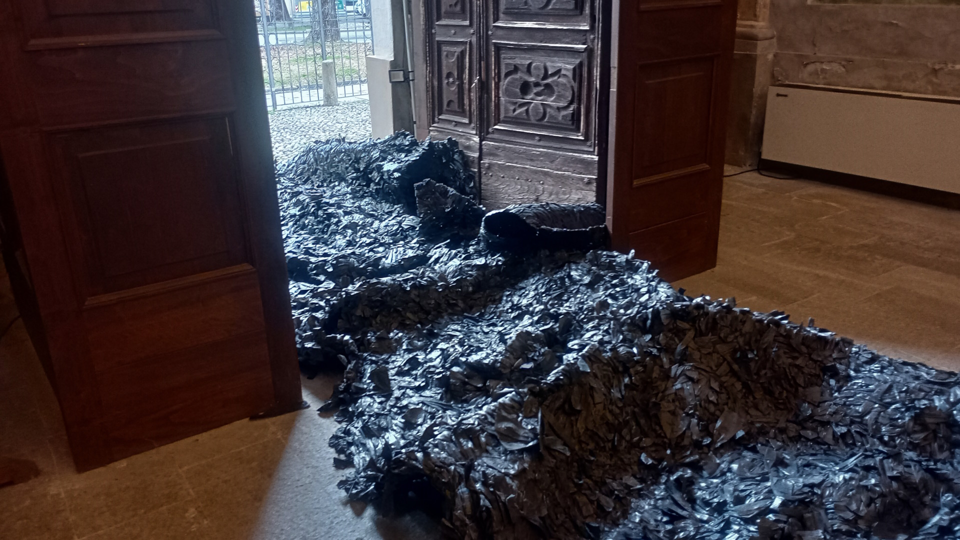 L’ombra nera, installazione iconica di Carla Crosio (che è stata allestita in eventi e sedi espositive di tutta Italia, sempre con modalità diverse), è già posizionata nella ex chiesa di San Vittore, ed è già visibile passando da Largo D’Azzo, anche se l’allestimento deve essere ancora rifinito.