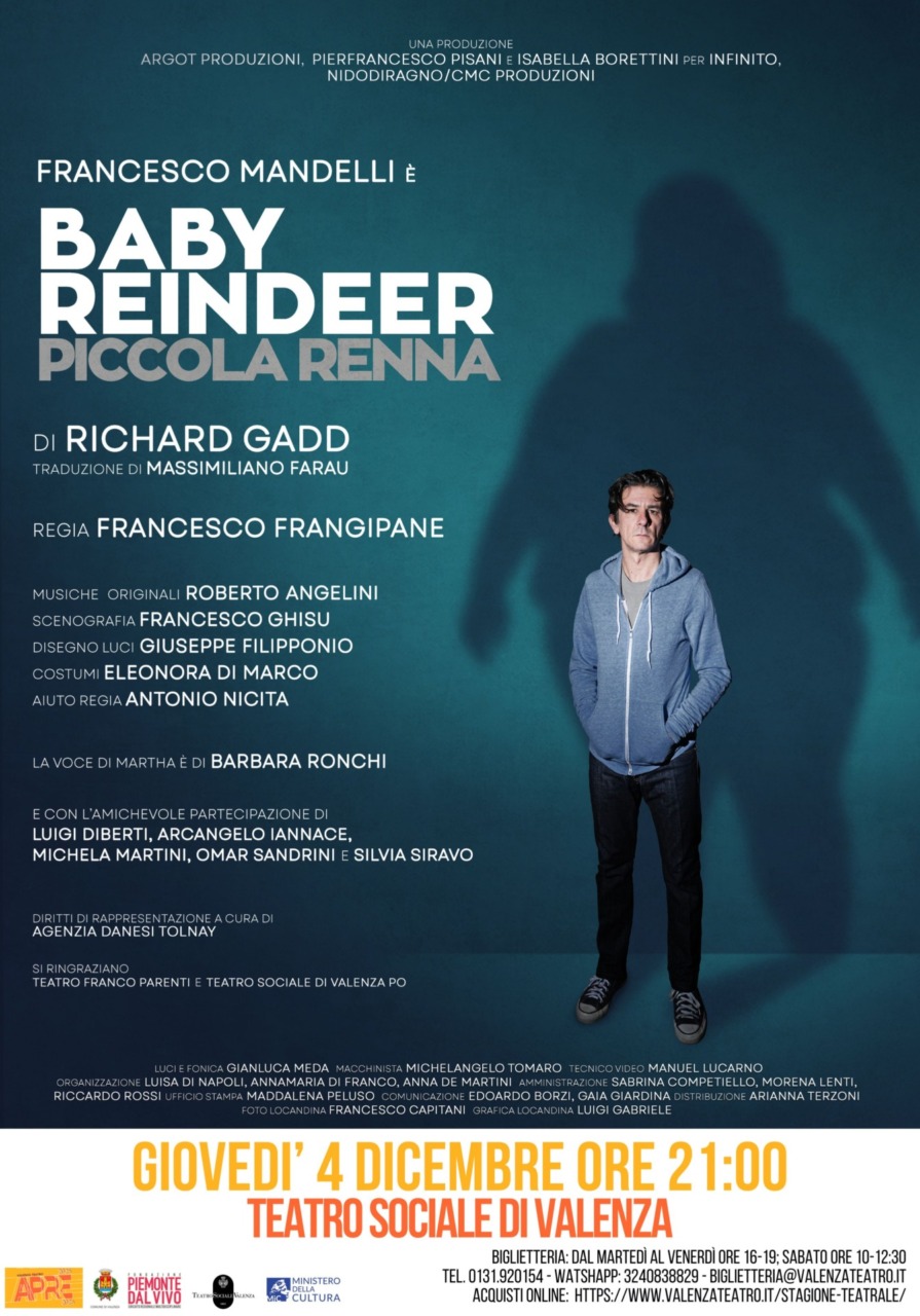 Baby Reindeer è un’opera prima imperdibile, che dà corpo al più discusso caso di stalking (per una volta visto da una prospettiva maschile) attraverso una narrazione intensa, intrecciata con linguaggi video e una colonna sonora incalzante. Il testo originale, che ha ispirato la fortunata serie Netflix e conquistato il pubblico internazionale, approda dunque finalmente a teatro in Italia, affidato all’eccezionale interpretazione di un attore versatile come Francesco Mandelli.
