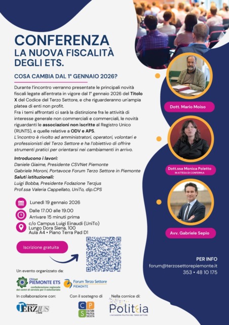 Lunedì 19 gennaio 2026, dalle 17 alle 19, presso il Campus Luigi Einaudi dell’Università di Torino, si terrà la conferenza “La nuova fiscalità degli ETS. Cosa cambia dal 1° gennaio 2026?”, dedicata alle principali novità fiscali introdotte dall’entrata in vigore del Titolo X del Codice del Terzo Settore.