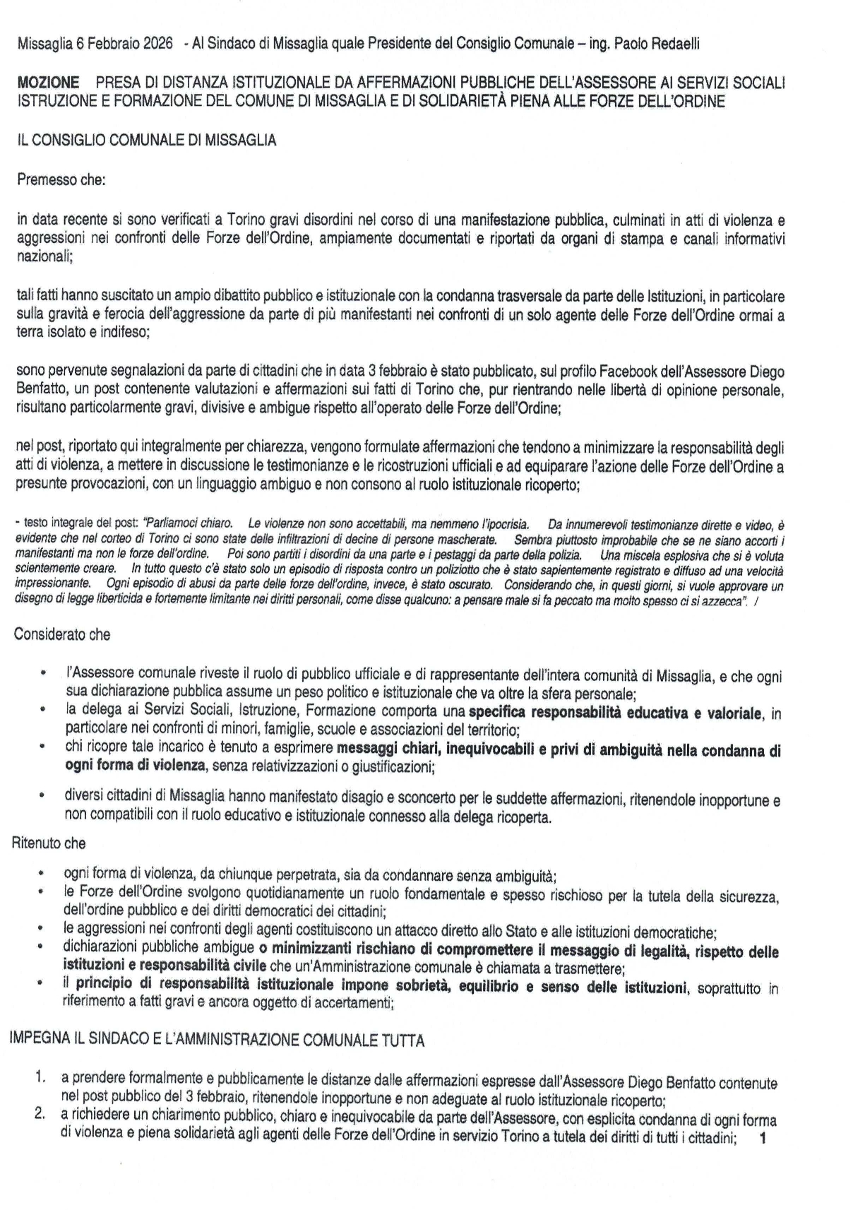 “Per questo – ha aggiunto Meregalli – abbiamo presentato una mozione che chiede all’Amministrazione comunale di prendere formalmente le distanze da tali affermazioni e di ribadire pubblicamente la piena fiducia nell’operato delle Forze dell’Ordine. È una questione di responsabilità istituzionale e di rispetto verso tutta la comunità di Missaglia”.