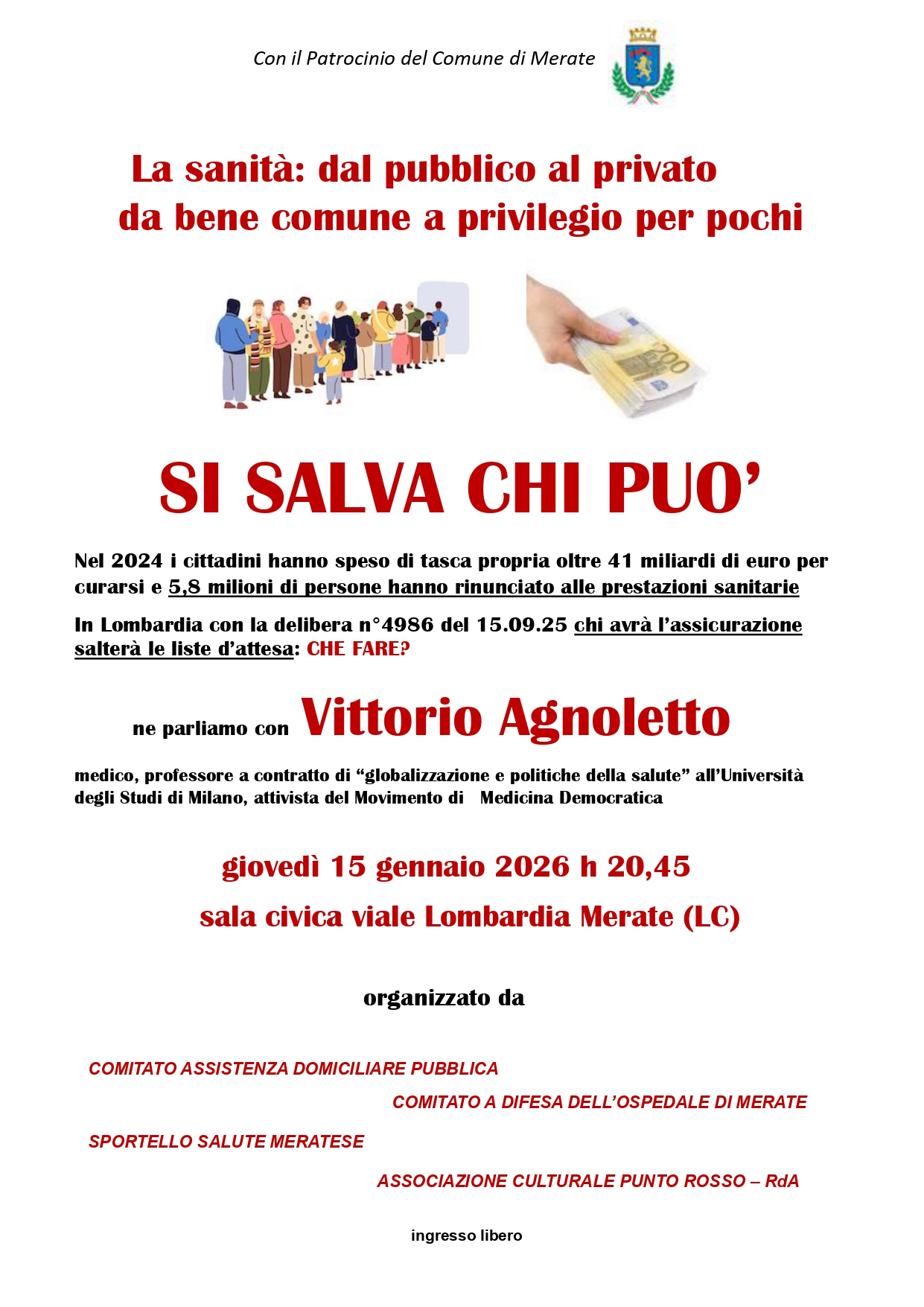 L’iniziativa è organizzata dai comitati Assistenza domiciliare pubblica e Difesa dell’Ospedale di Merate, insieme allo Sportello salute meratese e all’associazione Punto rosso, con il patrocinio del Comune di Merate.