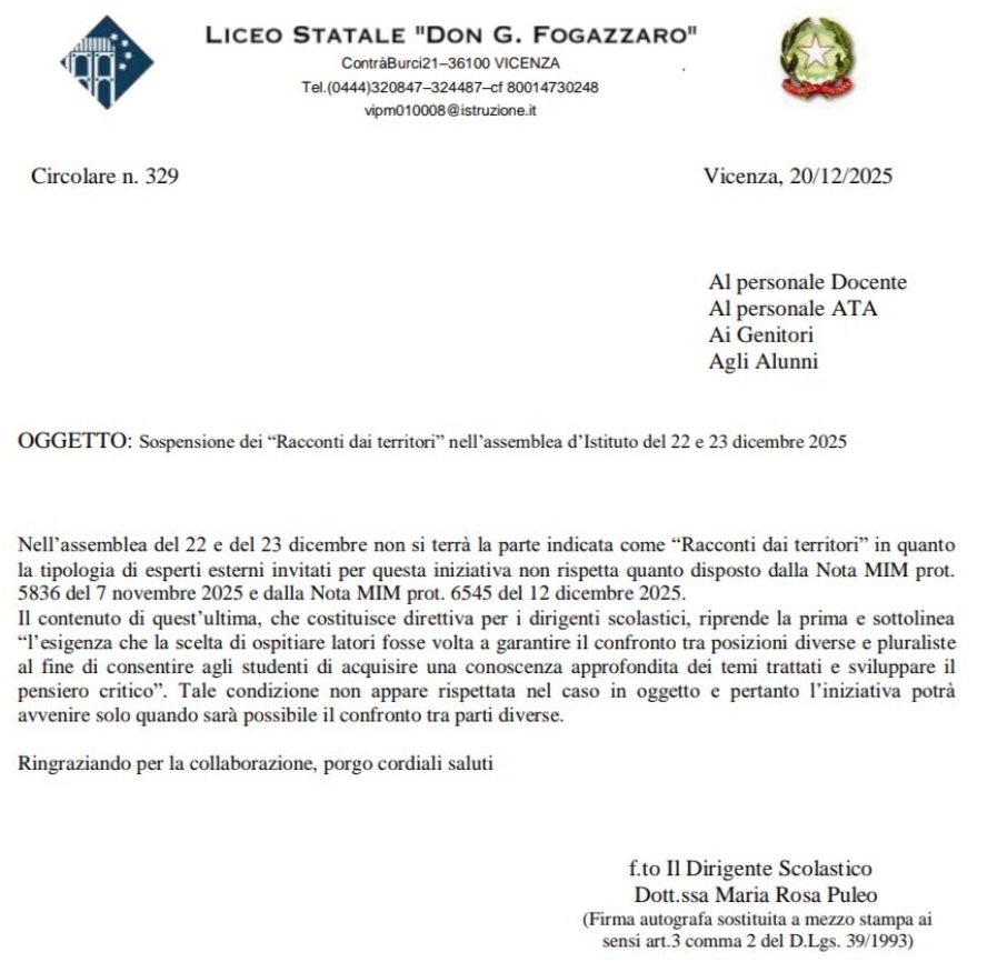 Al Liceo Fogazzaro di Vicenza (nella foto di copertina), la dirigente Maria Rosa Puleo, ha sospeso l’assemblea indetta dagli studenti, per la parte dedicata ai “Racconti dai territori” (quelli della Palestina), per mancato rispetto delle indicazioni del Ministero sul pluralismo.