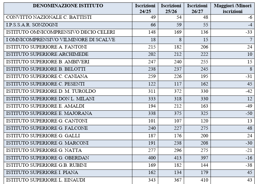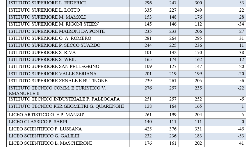 Tra i licei, arretrano in particolare il Galilei di Caravaggio (-53) e il Lussana (-45), mentre tiene il Sarpi e cresce il Mascheroni (+41). Il liceo artistico Manzù registra invece un lieve incremento (+5) . Più contenute le variazioni per altri istituti, come l’Oberdan (-16) ed il Weil (-12) di Treviglio, il Sonzogni di Nembro (-4) ed il Convitto Battisti  di Lovere (-6), mentre alcune realtà mostrano segnali positivi ma più moderati, come l’Archimede di Treviglio (+10) e il Don Milani di Romano (+12).
