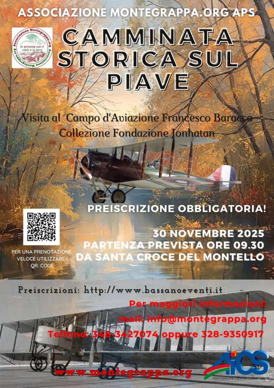 Ultima camminata sul Piave, prima dell’inizio della stagione delle ciaspolate sulla neve. Raggiunto il Campo d’aviazione Francesco Baracca, si farà visita al museo della Fondazione Jonathan Collection.