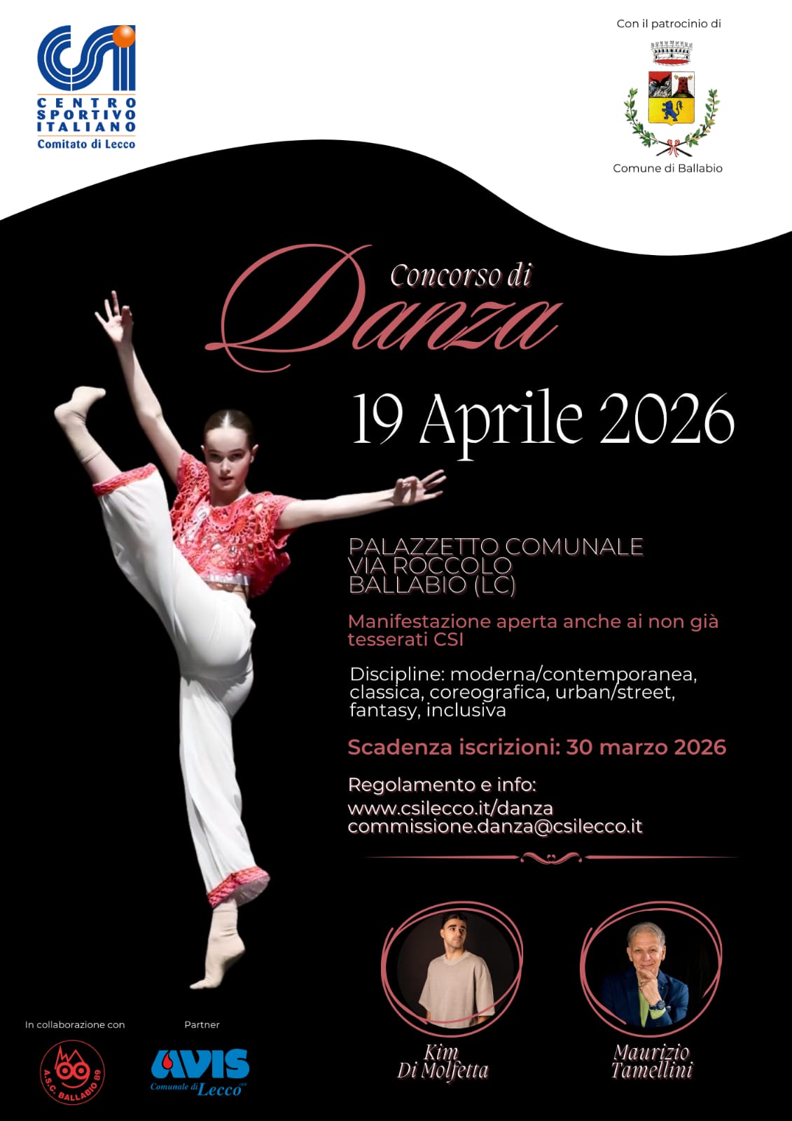 Domenica 19 aprile 2026  il Palazzetto Comunale di Ballabio ospiterà il Concorso di Danza CSI Lecco, un evento che vedrà protagonisti 228 atleti provenienti da 10 scuole di danza del territorio. Un appuntamento che unisce sport, talento e valori educativi, sostenuto con convinzione da AVIS Comunale Lecco, partner ufficiale della manifestazione.