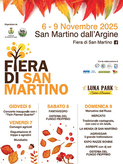 Dal 6 al 9 novembre 2025 torna il tradizionale appuntamento con la Fiera di San Martino a San Martino dall’Argine. Tanti eventi e iniziative in programma. Sabato e domenica ci saranno le serate gastronomiche della Proloco con l’Osteria del Fungo Pioppino e uno specifico menù autunnale che verrà servite nel gazebo coperto e riscaldato.