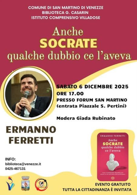 Il giorno 6 dicembre 2025, dalle ore 17,00 presso il Forum San Martino, il Comune, in collaborazione con la Biblioteca “G. Casarin” e l’Istituto Comprensivo Villadose, ha il piacere di avere ospite il prof. ERMANNO FERRETTI, sul tema GIOVANI E FILOSOFIA.