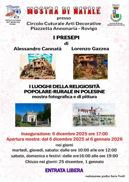 Nelle 2 sale di piazzetta Annonaria di Rovigo verrà allestita una Mostra di PRESEPI dei signori Alessandro Cannatà e Lorenzo Gazzea.