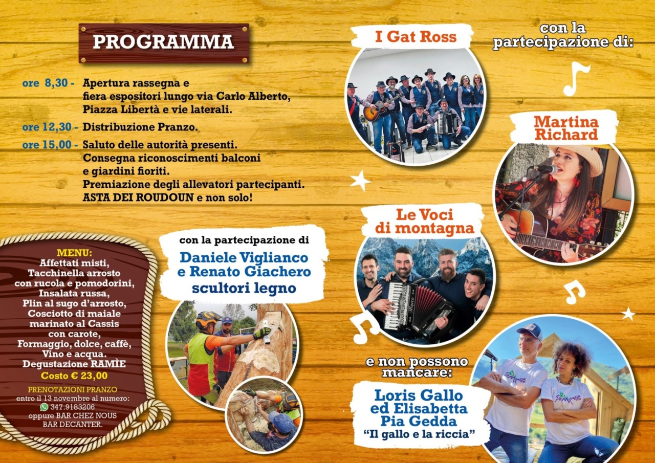 Alle 12,30 è in programma il tradizionale pranzo, allietato da musica e canti, occitani e non solo. La partecipazione al pranzo è prenotabile entro venerdì 14 novembre presso i bar Chez Nous e Decanter, oppure chiamando il numero telefonico 347-9183206. Alle 15 sono in programma la premiazione degli allevatori, dei balconi e dei giardini fioriti e l’asta dei roudoun, i tradizionali e artistici campanacci delle mucche.
