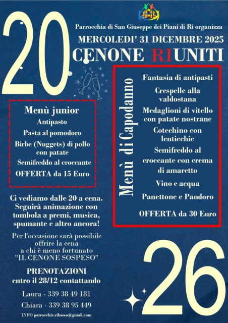 Mercoledì 31 dicembre dalle 20.30, torna il “Cenone Ri-uniti” nel salone della Parrochia di Ri, a Chiavari.