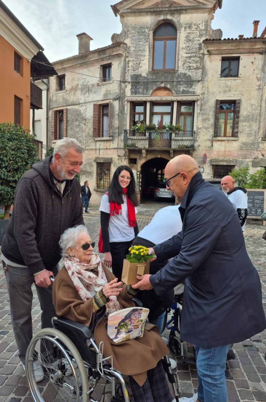 In piazzetta Angarano, i partecipanti hanno approfittato per concedersi un ristoro mentre anche agli anziani ospiti veniva offerta una bibita, un omaggio floreale da parte dell’AVO Bassano Odv che aveva organizzato uno stand per una giornata di sensibilizzazione sul volontariato, ed un piccolo ed altrettanto gradito cappello alpino, in ricordo della giornata.