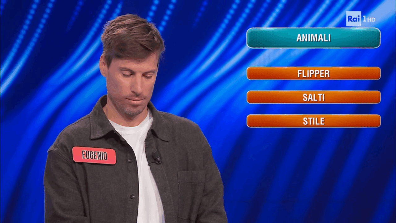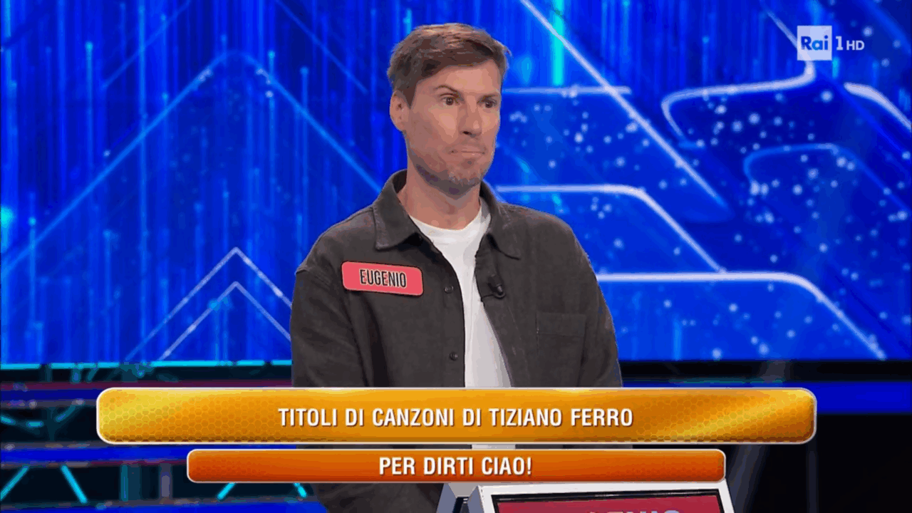 Al primo gioco, C’è o non c’è, è capitata la categoria: Canzoni di Tiziano Ferro. Eugenio, purtroppo, ha sbagliato alla prima domanda, quando Marco Liorni gli ha chiesto se “Per dirti ciao!” l’avesse scritta il cantante di Latina.