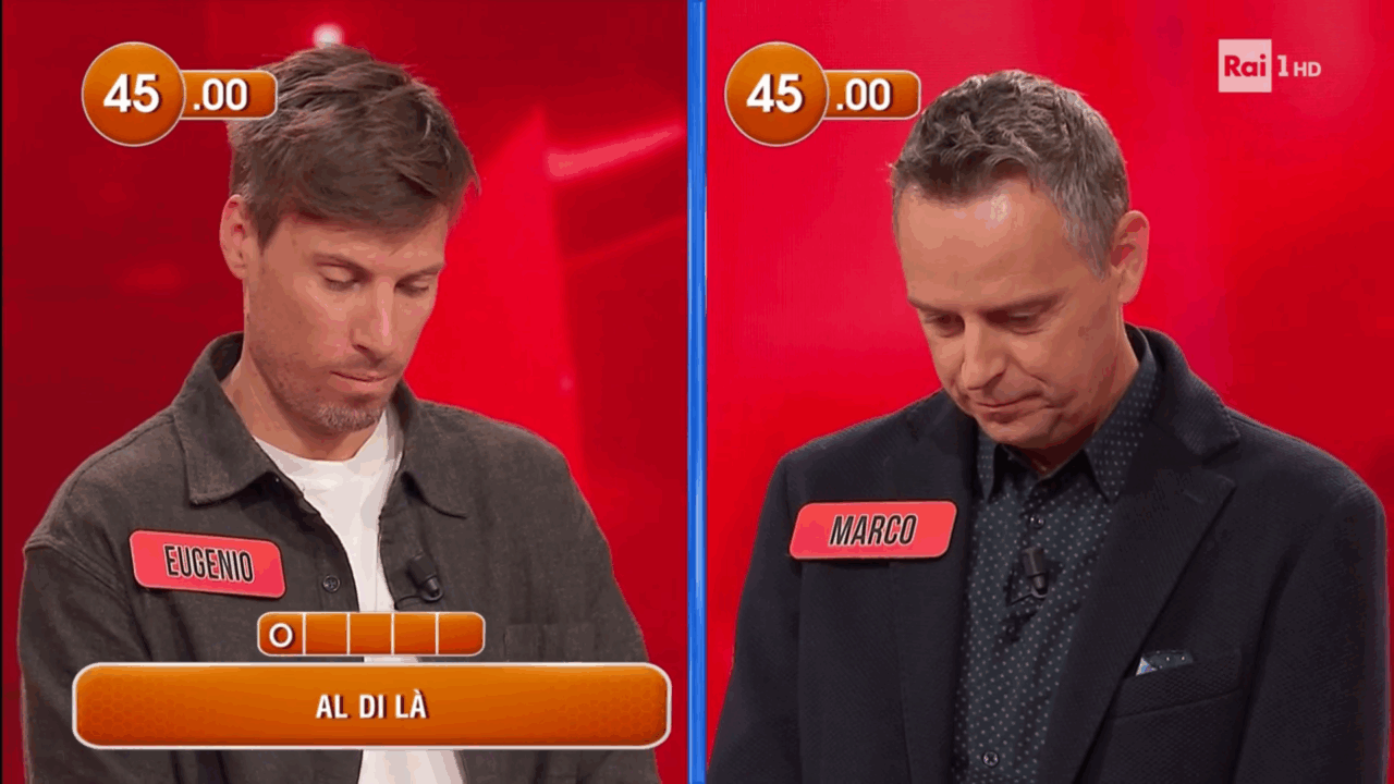 Anche la terza domanda, non è andata a segno, illuminatolo di rosso e costringendolo alla sfida. Eugenio ha scelto così di sfidare Marco, un altro debuttante.