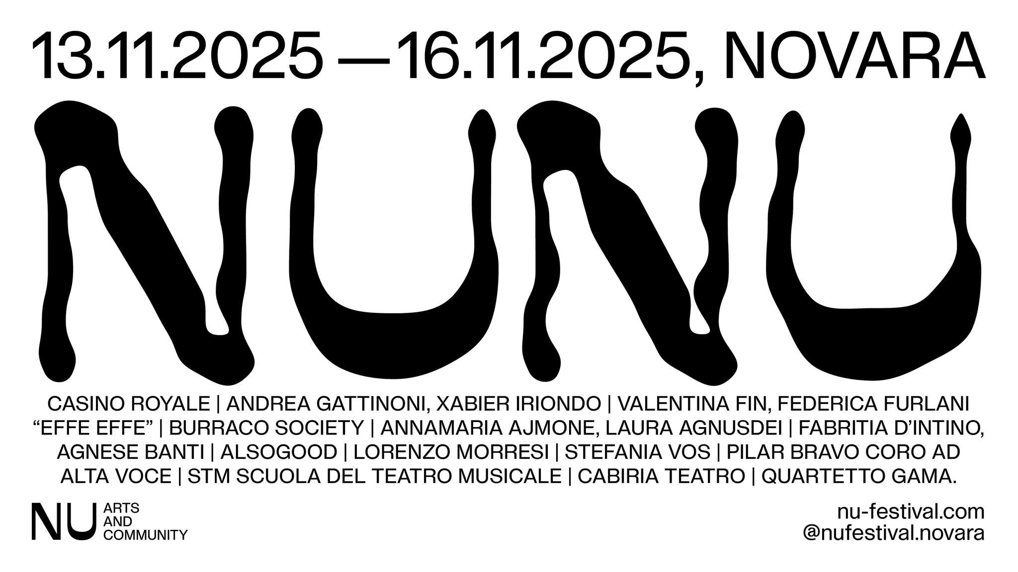 Organizzato dal Comune di Novara – Assessorato e Ufficio Cultura – e realizzato dall’Associazione Culturale Rest-Art, NU conta sul sostegno di Ministero della Cultura, Regione Piemonte, Fondazione CRT, Fondazione Compagnia di San Paolo e Fondazione Banca Popolare di Novara, oltre alla collaborazione con Fondazione Piemonte dal Vivo e Fondazione Teatro Coccia.